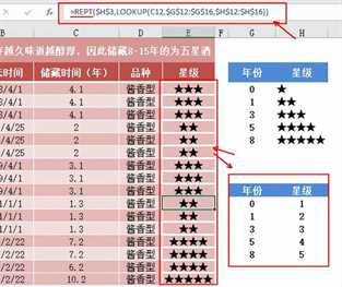 虽然也用到了lookup函数,但作者修改了辅助列,将星级使用数字来表示,而此外,还添加了一个REPT函数。