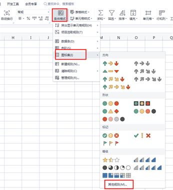 选中数据——点击工具栏【开始】——【条件格式】——【图标集】——【其他规则】