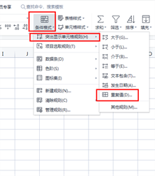 选中数据——点击工具栏【开始】——【条件格式】——【突出显示单元格规则】——【重复值】;