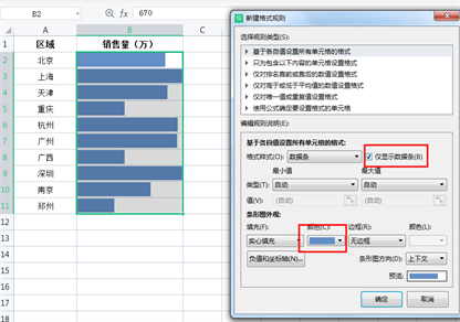 如果觉得数据影响数据条的展示,可以将数据去除。首先复制数据,然后选中一列数据,点击数据条,之后点击其他规则中勾选仅显示数据条。