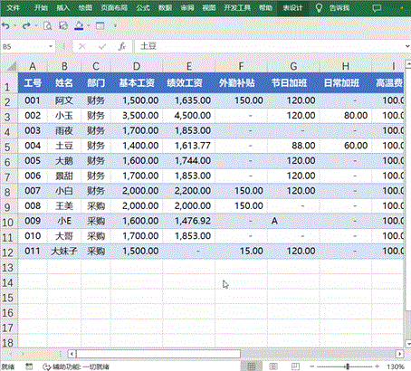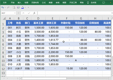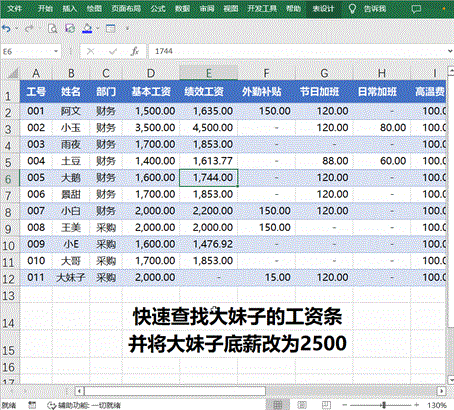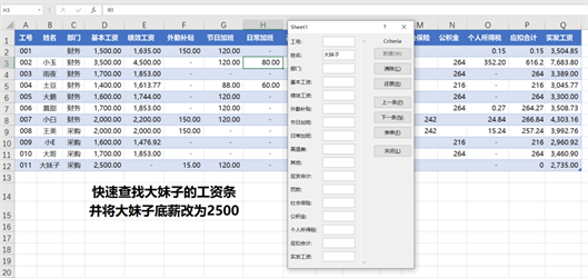 除了翻阅记录外,还通过条件来查找关键字段,比如下图案例查找“大妹子”,并将大妹子的基本工资改为2500