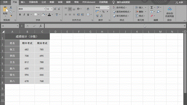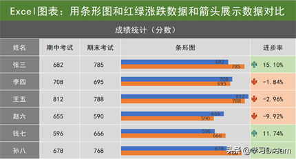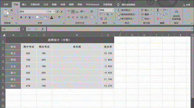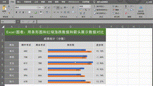 我们加上第4列条形图、第5列进步率,其中进步率采用公式计算,即=期末成绩/期中成绩-1,采用百分比的数据格式。