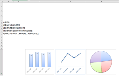 将三个图形调整大小,位置,放置在C30,D30,E30三个单元格中。在使用之前我们准备的名称管理器对图片进行链接。图表就完成了,是不是看上去很高大上呢。
