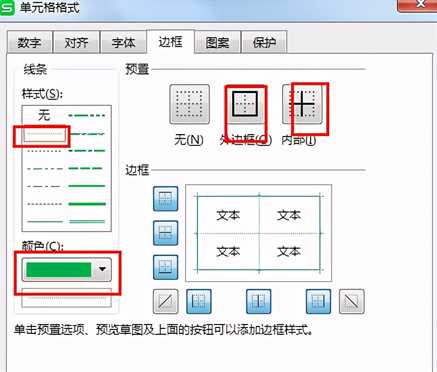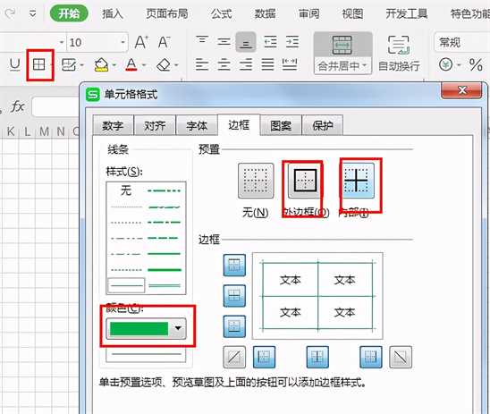③、再选择“边框”——“其他边框”,颜色选择“绿色”,再点“外边框”和“内部”,然后确定;