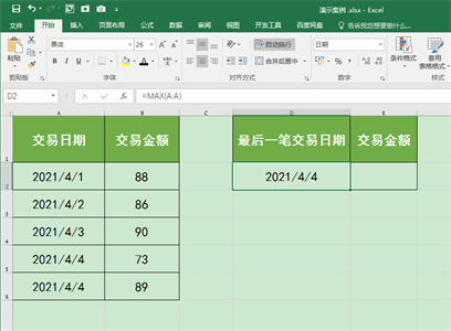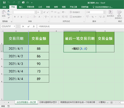 最佳答案应用场景下图工作表A列和B列中记录了不同日期的交易数据,且随着时间的推移,交易数据会不断增加。接下来我们想在D2和E2单元格中动态获取A列和B列中的最后一条交易数据。操作步骤1.选中D2单元格,在英文输入法状态下输入公式:=MAX(A:A),按回车键确认公式,即可返回A列中最新的日期数据“2021/......
