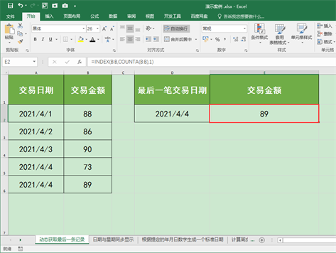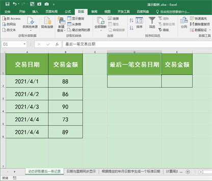 下图工作表A列和B列中记录了不同日期的交易数据,且随着时间的推移,交易数据会不断增加。接下来我们想在D2和E2单元格中动态获取A列和B列中的最后一条交易数据。