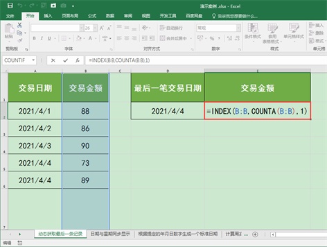 第二个参数COUNTA(B:B)代表B列中非空单元格的个数,即最后一笔交易记录的交易金额所在行数;