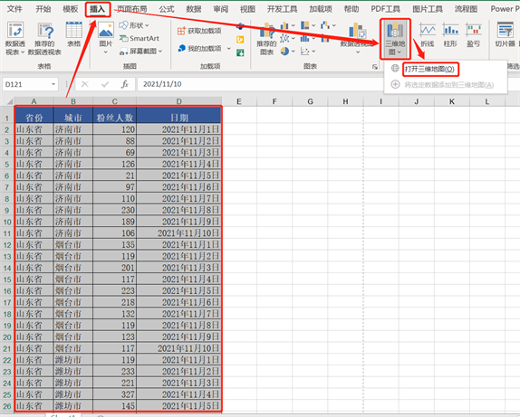 1、选中单元格区域——点击“插入”——点击“三维地图”——点击“打开三维地图”,即可将选中的数据添加到地图中去了,如下图所示: