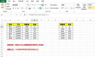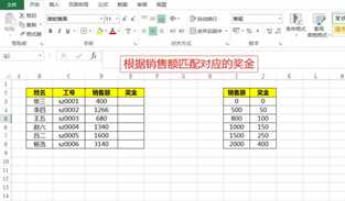 案例说明:如下图所示,我们需要根据人员的销售额数据,按照右边的奖金规则,快速匹配对应人员的奖金数据。规则为:销售额<500奖金为0;500<=销售额<800奖金50等。
