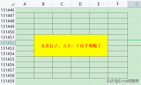 事实上,我们日常工作中的数据行数可能远远不止上面例子中的这么一点,而是可能几百,乃至成千上万行,这时候我们在用下拉的方式可能就有点力不从心了。特别是在表格数据量较大,电脑配置不高的情况下,可能在下拉过程中卡死了,更不用说下拉的时候鼠标都快拉到桌子底下啦!