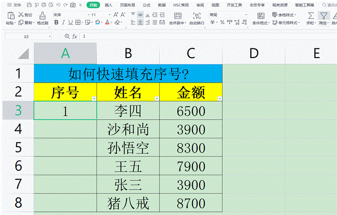 注意:记得跟前面讲述的一样,先在序号开始行录入个数字1,此必不可少!