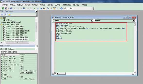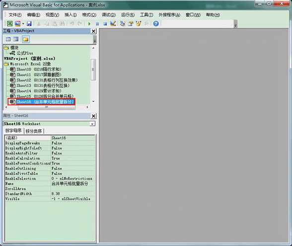 2. 在打开的VBA编辑器窗口左侧,找到“Microsoft Excel对象”列表中的“Sheet16(合并单元格批量拆分)”,也就是我们要进行处理的工作表,双击鼠标。