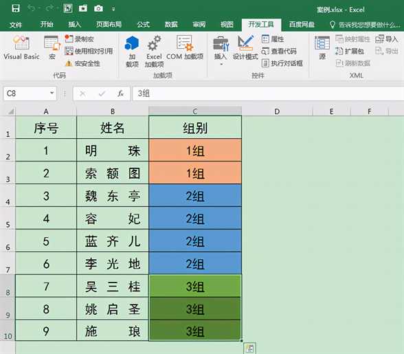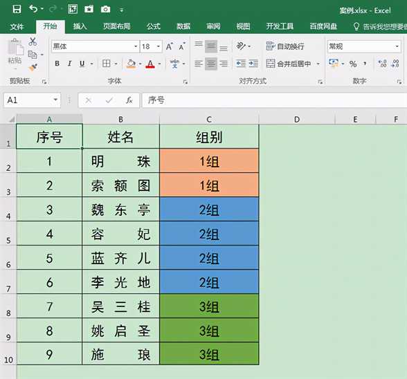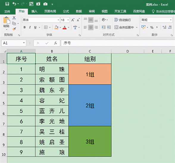 5.返回工作表,可见C列“组别”列中所有合并单元格已经全部拆分为了独立的单元格。