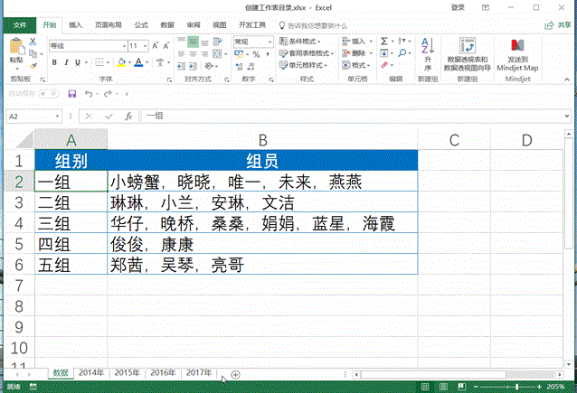 例如下图是一个excel工作簿,里面有5个工作表,需要创建一个工作表目录,在目录里点击对应的工作表名称就能快速跳转到对应工作表中。
