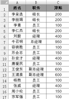 图所示的表格中展示了某公司职工的津贴数据,其中B列记录了所有职工的”职务”,现在需要按照”职务”的高低对数据列表进行排序,方法如下。