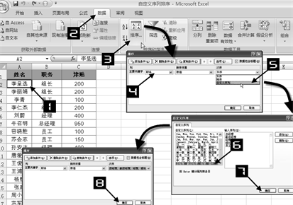 在【主要关键字】列表框中选择”职务”字段,【次序】设置为”自定义序列”,打开【自定义序列】对话框,选择【自定义序列】列表中自定义的”职务”序列。