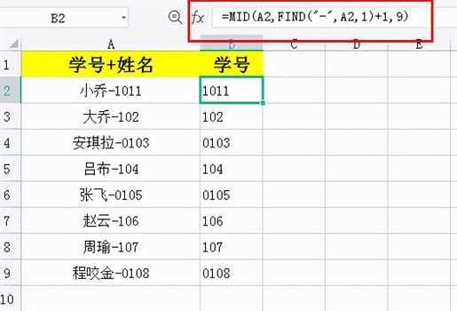 公式【=MID(A2,FIND(“-“,A2,1)+1,9)】