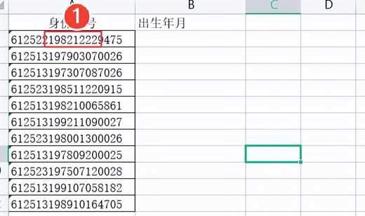 1、如下图,我们想从左侧的这列身份证中提取出生年月。