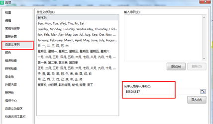 然后在打开的【Excel选项】对话框中选择【自定义序列】,在此时的单元格导入序列右下角选择【导入】,添加了自定义序列后,点击【确定】;