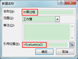 2.在打开的“新建名称”对话框中可以设置“名称”和“引用位置”,这里设置“名称”为“计算过程”,“引用位置”为“=Evaluate(a2)”,最后单击“确定”按钮。