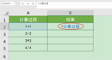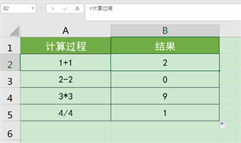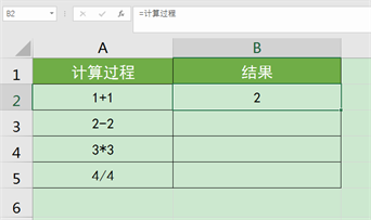 3.将光标定位在B2单元格中,输入“=计算过程”,按回车键进行确认,即可在B2单元格中返回A2单元格中算式“1+1”的计算结果“2”。