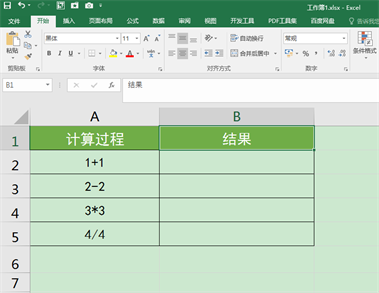 下图中A列显示的是计算过程,接下来我们想在B列的单元格中快速批量计算出A列单元格中算式的计算结果。