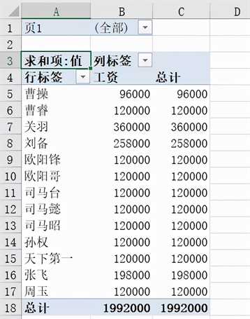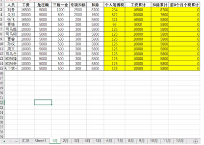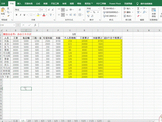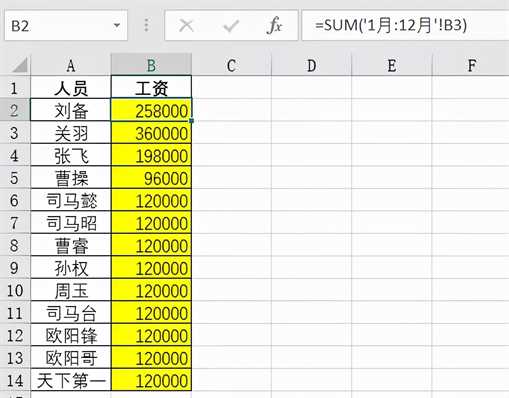 经观察,每个月的姓名和工资长短都是一致,并且顺序也一样。这是很特殊的案例,我们可以用sum函数快速搞定。e