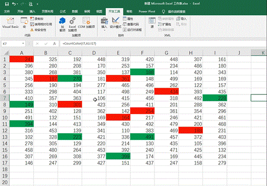 我们想要创建这个函数也非常的简单,只需要点击开发工具,然后点击visual basic,打开vba的编辑器,找到我们工作表所在工程文件直接将代码粘贴进去即可,接着我们直接关闭编辑然后在单元格中输入=CountColor即可使用该函数