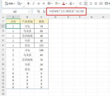 此公式中,VSTACK作为数组拼接函数,能将参数里的数组逐行拼接起来。其作用是把“1月”到“辅助表”之间所有工作表中A2:C6区域的数据逐行整合。