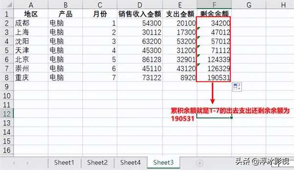 如上图小伙伴们可以看见在7月份剩余余额为190531,也就是说从第一个月到第七个月,除去开支后,咱们总共还盈利190531,一目了然对吧!