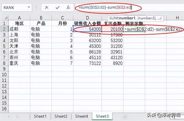 2,接着在输入完整的公式:=SUM($D$2:D2)-SUM($E$2:E2),如下图所示: