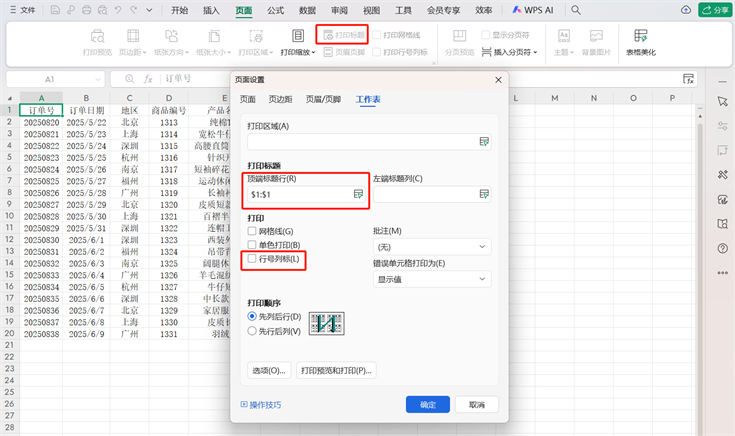除重复标题外,Excel还支持打印时附带行号列标。在“页面设置-工作表”选项卡中,找到“打印”区域,勾选“行号列标”选项。