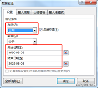 - 在数据验证的对话框,在允许里选择“日期”