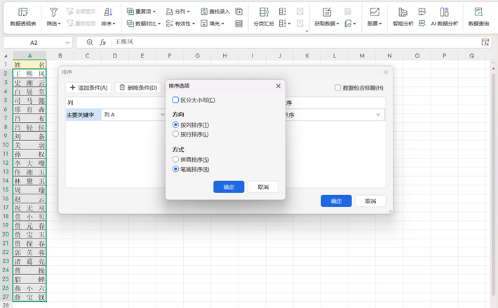 5.确认排序规则:完成设置后点击确定,系统将按“首字笔画数量→笔顺顺序(横竖撇捺折)→内码补位”的逻辑自动排序。具体规则如下: