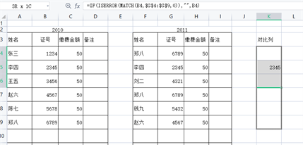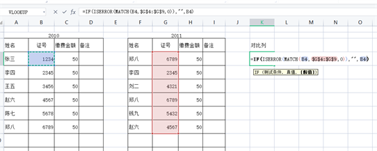 1、在对比列输入公式:=IF(ISERROR(MATCH(B4,$G$4:$G$9,0)),””,B4),意思是用B4与G4至G9中的每个值进行比较,如果存在,就在对比列K4中填写B4的值。