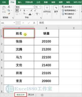 1、打开工作表,首先在“修改文件”工作表中,选择第1个单元格,即A1单元格,如下图所示。