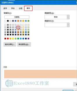 10、弹出“设置单元格格式”对话框,在“填充”选项卡中,选择一个喜欢的颜色色块,如下图所示。