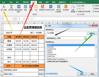第一步先利用SUM函数求出出差费用花费的总额。SUM函数的使用方法为:公式—-插入函数—-输入函数名称SUM函数—-点击转到—-点击确定。