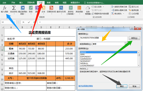 第二步利用NUMBERSTRING函数把小写金额转换成大写中文金额。NUMBERSTRING函数的使用方法为:公式—-插入函数—-输入函数名NUMBERSTRING函数—-点击转到—-点击确定。