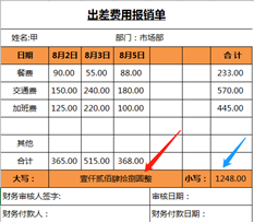 利用NUMBERSTRING函数把出差费用报销单小写金额转换成中文大写金额的具体公式为: