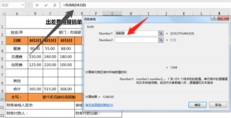 利用SUM函数求出差费用报销单总金额的具体公式为:=SUM(G4:G8)