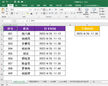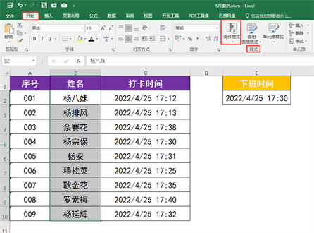 5 返回工作表,可见下班打卡时间早于2022/4/25 17:30的人员姓名已经全部用红色字体进行了突出显示。