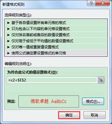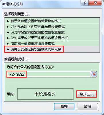 2 在打开的“新建格式规则”对话框中,在“选择规则类型”列表中选择“使用公式确定要设置格式的单元格”,在“编辑规则说明”下面的“为符合此公式的值设置格式”编辑框中输入:“=C2<$E$2”,再单击“格式”按钮。