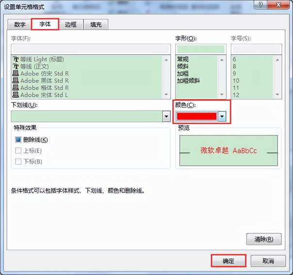 3 在打开的“设置单元格格式”对话框中,在“字体”选项卡下设置“颜色”为红色,再单击“确定”按钮。