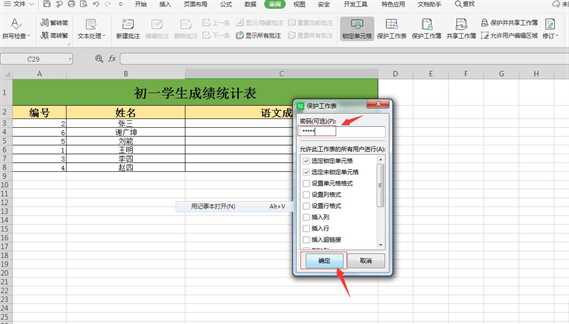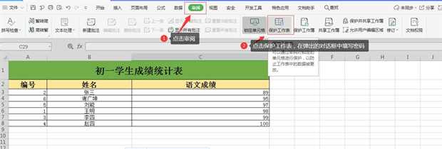 2、接下来步骤如下点击“审阅”-“保护工作表”-在弹出的对话框里面填写密码确定即可