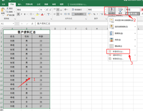 关键点:新建规则,使用公式确定要设置格式的单元格,选择要设置的区域,在“开始”菜单中单击“条件格式” 在展开的下拉列表中单击“新建规则”选项。