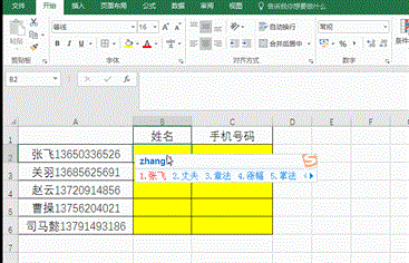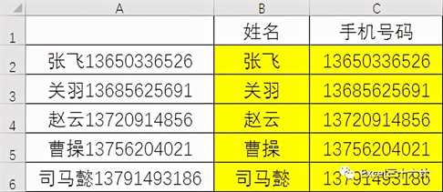 首先,分别将手机号码和姓名填写B2和C2单元格,然后选中B2至B6单元格,按组合键:ctrl+E,就能快速填充姓名。再选中C2至C6单元格,按组合键:ctrl+E,就能将手机号码快速填充到C列。