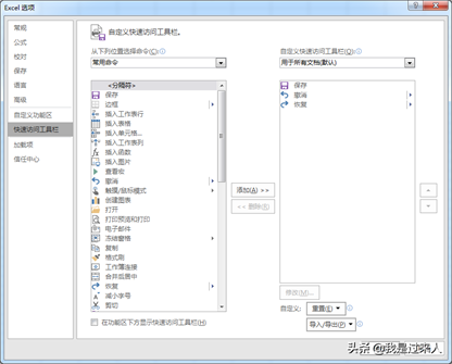 在Excel选项中,可以重新排列快速访问工具栏上的图标。选择按钮时,将激活列表右侧的向上和向下箭头,您可以使用这些箭头按钮重新排列选定命令的按钮。