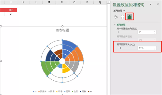 之后我们选中图表,鼠标右键设置数据系列格式,在系列选项中,我们调整圆环图圆环内径大小。