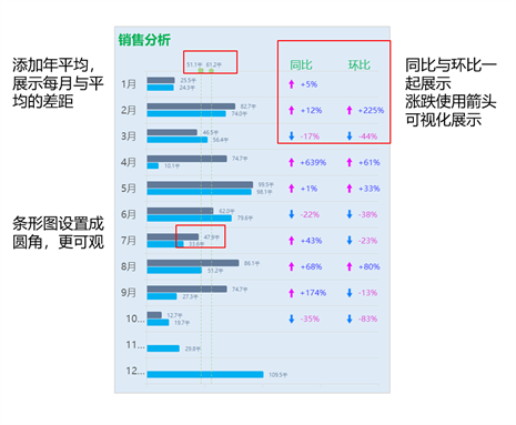 最佳答案小编编制的这个图表,就将以上信息进行了汇总展示。特点:1、条形图系列是今年与去年的比较使用条形图。仔细观察一下,是不是条形图是加了小圆角的呢2、同比、环比在旁边展示,可以让领导清楚销售趋势。使用涨跌箭头,红色表示减少,蓝色表示增长,可视化表达更足。3、年平均也一同反映在图表上,可以将本月与今年年均、......